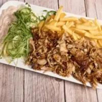 Jungbullen-Drehspießfleisch mit Pommes frites und Sauce nach Wahl