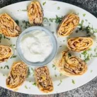 Jungbullen-Drehspießfleisch mit dünnem Teig, Tomatensauce und Naturjoghurt