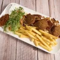 Jungbullen-Drehspießfleisch, 3 Stück Falafel, Beilage nach Wahl, Salat, Tzatziki und Cocktailsauce
