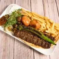 gemischter Grillteller mit 1 Lammspieß 1 Hähnchenspieß 1 Hähnchensteak 1 Hackfleischspieß Hackfleischbällchen Jungbullen-Drehspießfleisch 1 Beilage nach Wahl pommes oder reis