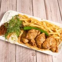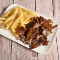 Jungbullen-Drehspießfleisch mit Pommes frites und Sauce nach Wahl