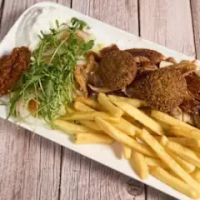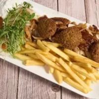 Jungbullen-Drehspießfleisch, 3 Stück Falafel, Beilage nach Wahl, Salat, Tzatziki und Cocktailsauce