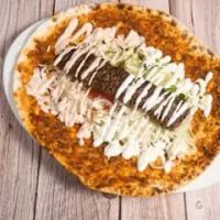 Jungbullen-Drehspießfleisch, dünnem Teig, Tomatensauce, Naturjoghurt