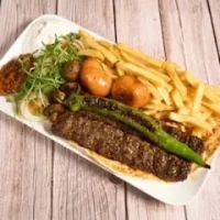 gemischter Grillteller mit 1 Lammspieß 1 Hähnchenspieß 1 Hähnchensteak 1 Hackfleischspieß Hackfleischbällchen Jungbullen-Drehspießfleisch 1 Beilage nach Wahl pommes oder reis